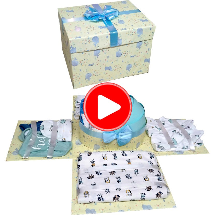 Searching for the perfect baby shower gift? Our Blue Prince Cradle Explosion Box is a stunning, practical, and unforgettable way to welcome a newborn baby boy! This unique 1-layer box doesn't just hold gifts—it explodes open to reveal a gorgeous cradle centerpiece and a complete collection of essential newborn necessities.